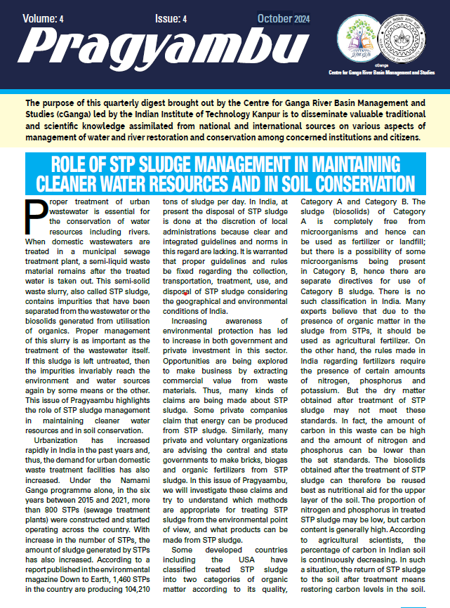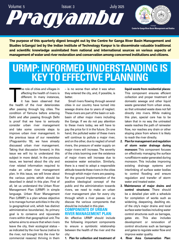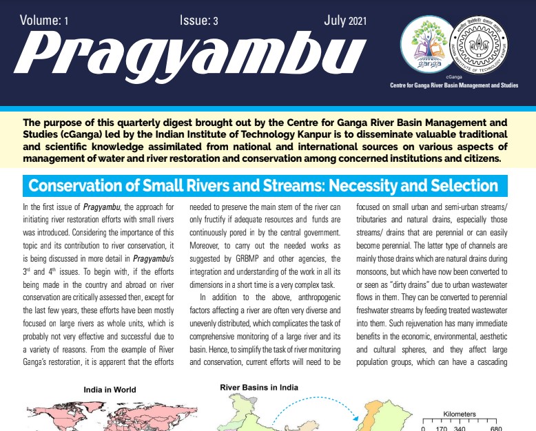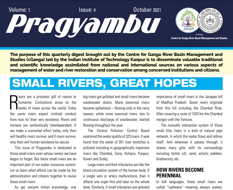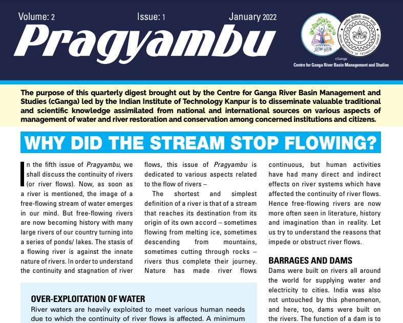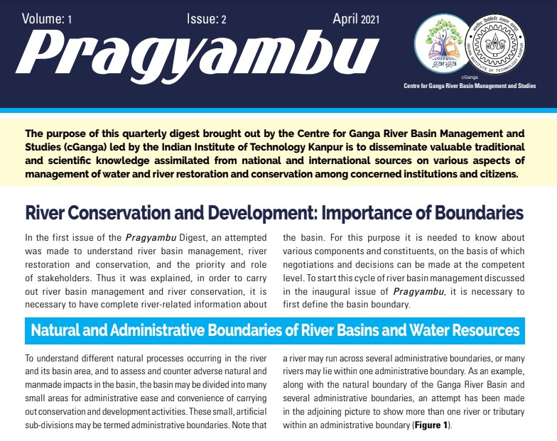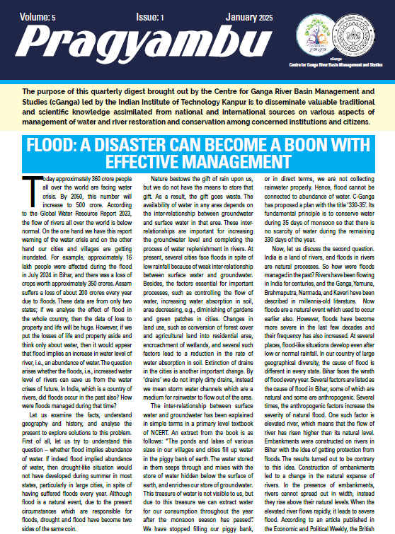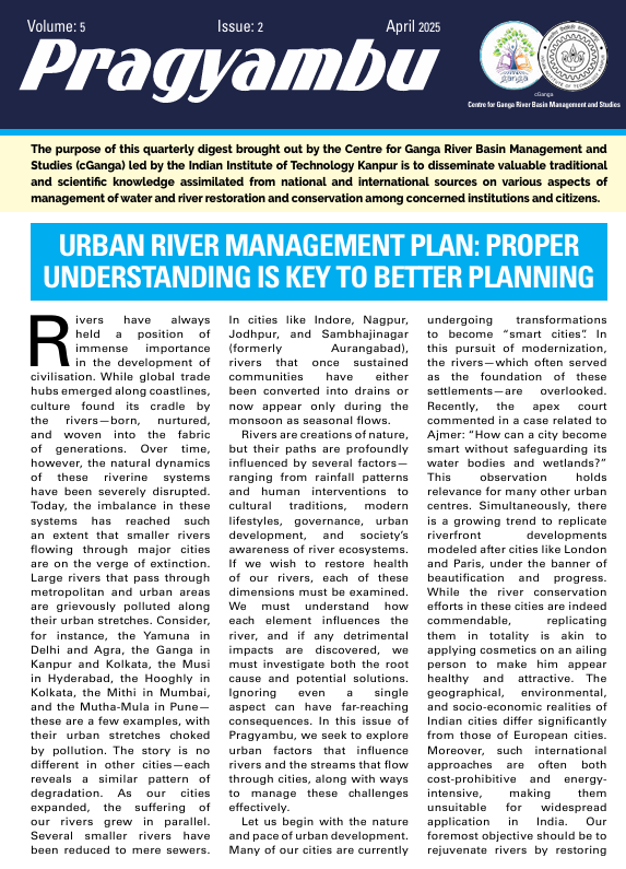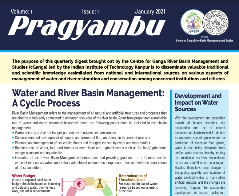 The purpose of this quarterly digest brought out by the Centre of Ganga River Basin Management and studies (cGanga) lead by the IIT Kanpur is to disseminate valuable traditional and scientific knowledge assimilated from national and international sources on various aspects of management of water and river restoration and conservation among concerned institutions and citizens.
